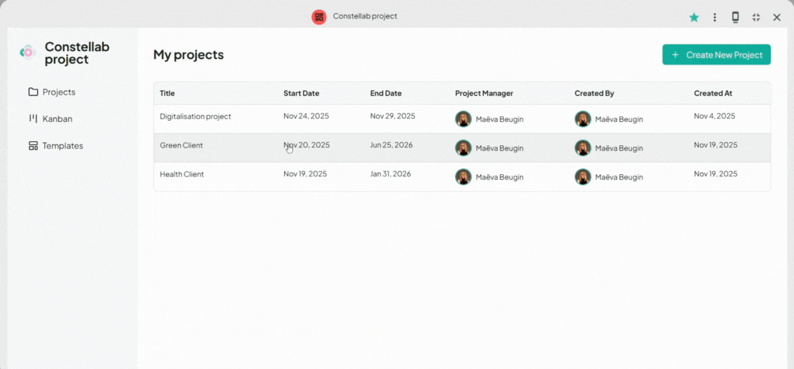 Constellab Project est un espace de travail unifié pour gérer projets, tâches et clients, directement connectés aux données scientifiques.Il offre une vision claire de l’avancement grâce aux vues Kanban et Gantt, tout en réduisant la complexité de la coordination. En reliant projets, données et résultats dès le départ, il élimine les silos et améliore la traçabilité.Résultat : des projets plus efficaces, une meilleure collaboration et une préparation naturelle à l’IA et à l’analytics.